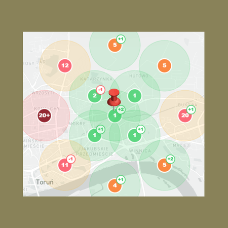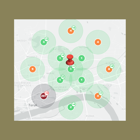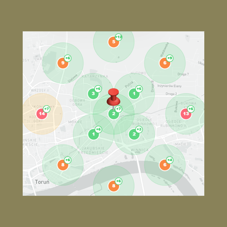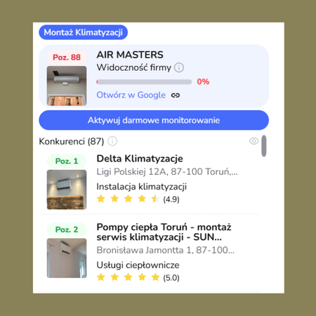 Kółka z liczbami oznaczają pozycję wizytówki mojego klienta na liście wyszukiwania w danym miejscu.
